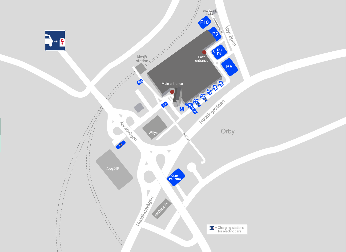 We have 24 charging points for those who come with an electric car. These can be found at the P2 entrance to the garage. More public charging points are available at Älvsjö idrottsplats infartsparkering, about 450 meters from Stockholmsmässan’s main entrance. Charging is free of charge, and you only pay the regular parking rate. The electricity used by Stockholm Parkering in its charging stations is marked with good environmental choices and comes from renewable sources.