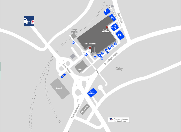 Vi har 24 st laddplatser för dig som kommer med elbil. Dessa hittar du vid infarten P2 i garaget. Fler publika laddplatser finns vid Älvsjö idrottsplats infartsparkering, cirka 450 meter från Stockholmsmässans huvudentré. Laddningen är kostnadsfri, och ni betalar enbart ordinarie parkeringstaxa. Den el som Stockholm Parkering har i sina laddplatser är märkt med bra miljöval och kommer från förnybara källor.
